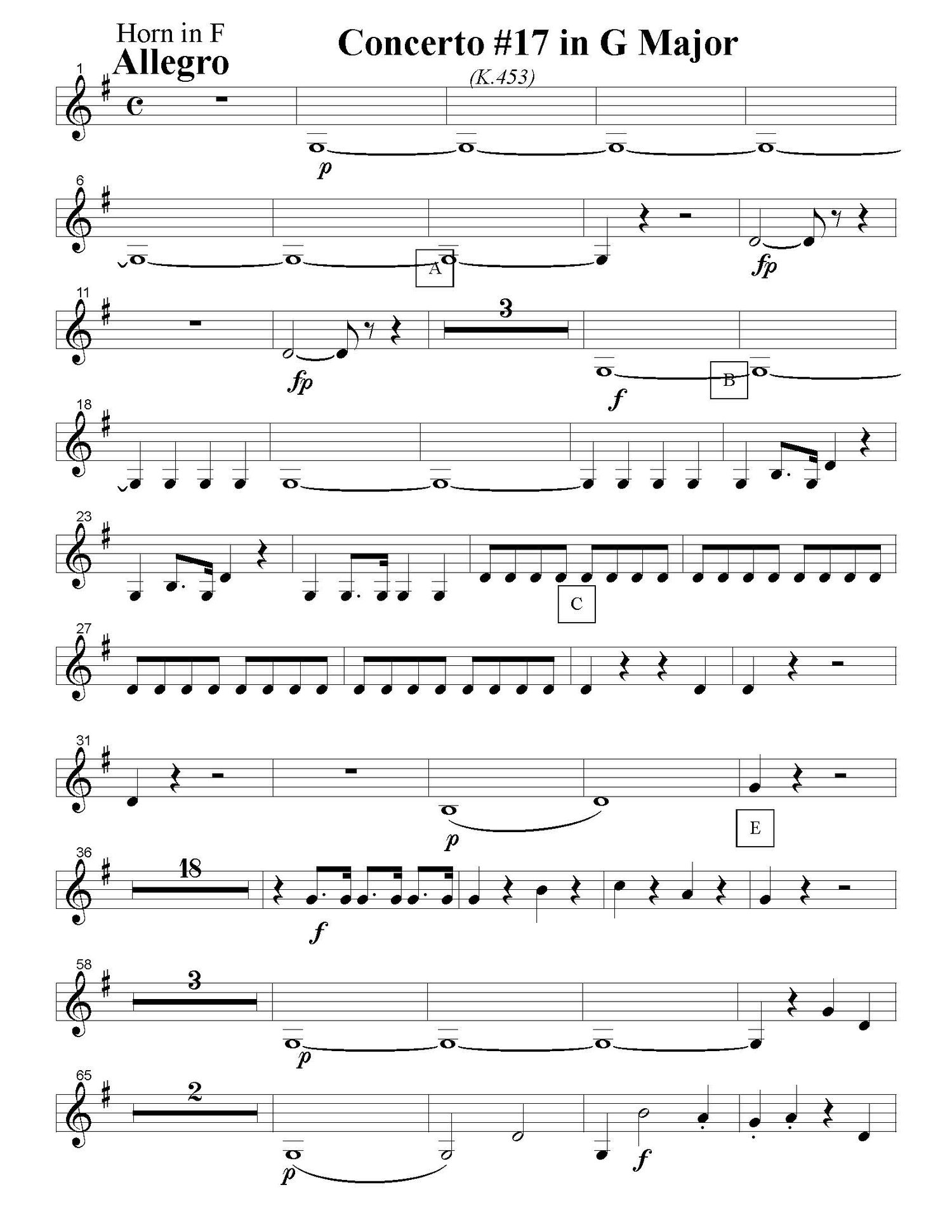 Title: Concerto in G Major (k453) with parts for cello, guitar, violin 1, violin 2, viola, flute, oboe, bassoon and horn